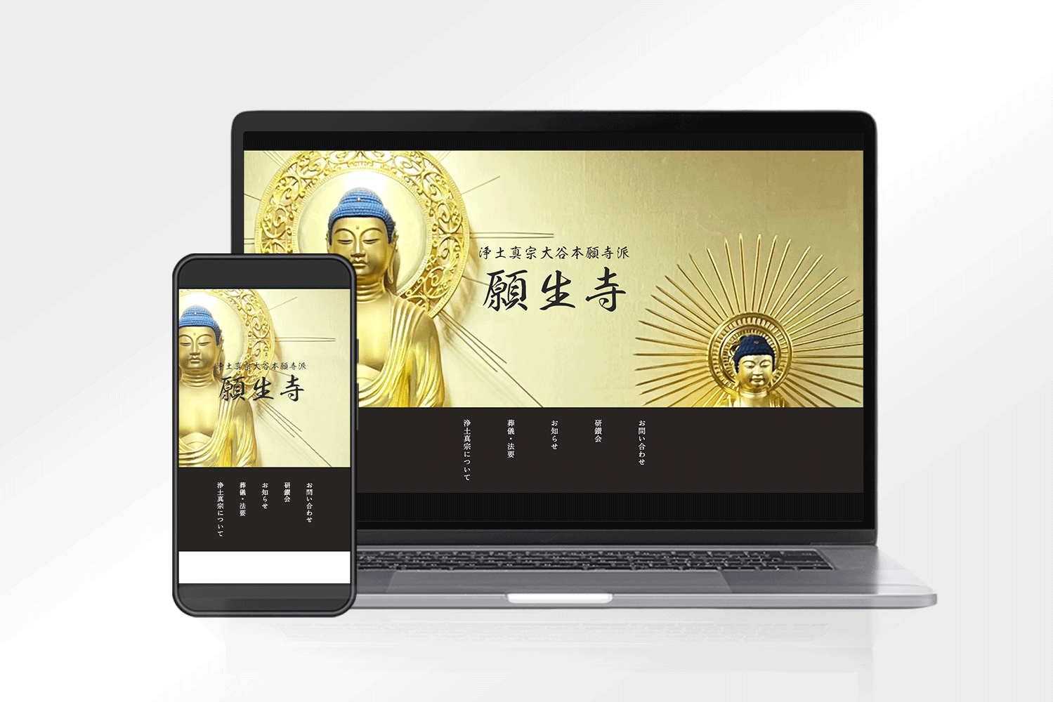 阿弥陀如来像を大きくファーストビューに使用。全体を落ち着いたトーンでまとめました。