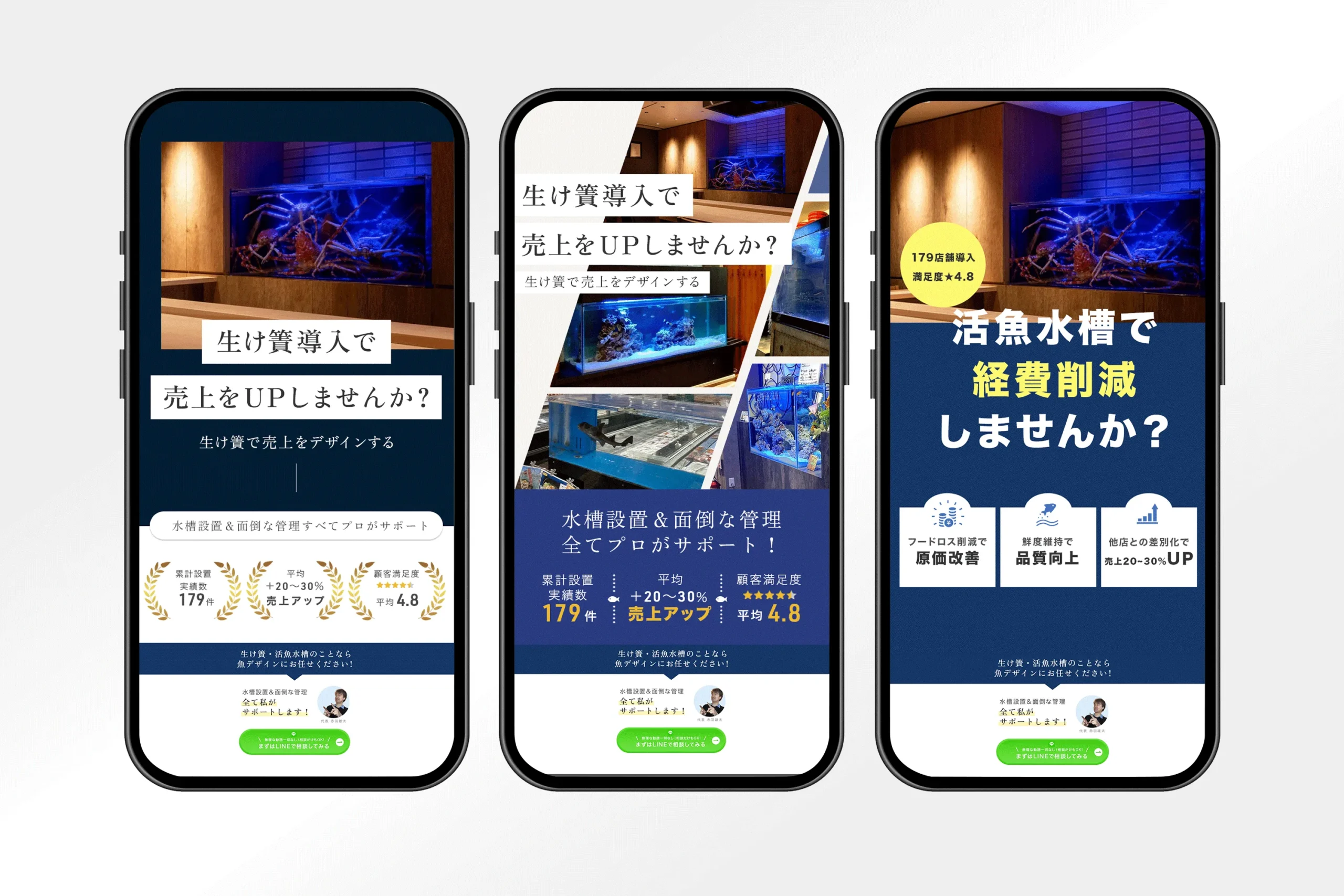 ご希望の高級感のあるパターンと、後に続くLINEボタンに進みやすくするため少し敷居のを下げたゴシック体&経費削減を打ち出した別レターパターンをご提案。サービスかわかるように文字を大きく配置、目立たせたい文字を目立たせる構成で作成しました。