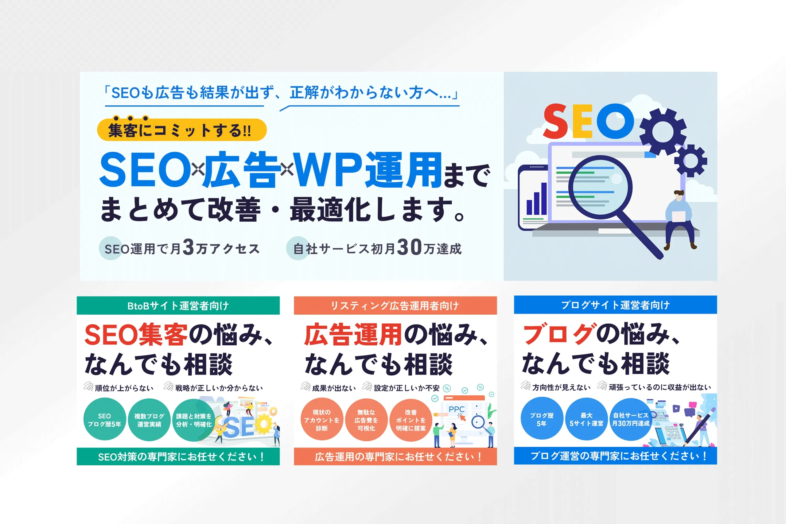 (B案)・SEOのイメージでGoogleカラーを使用したイラストを配置。左から目線が動くので左に文字を配置。イラストはビジネス向けのシンプルなものを採用し信頼感を持たせました。