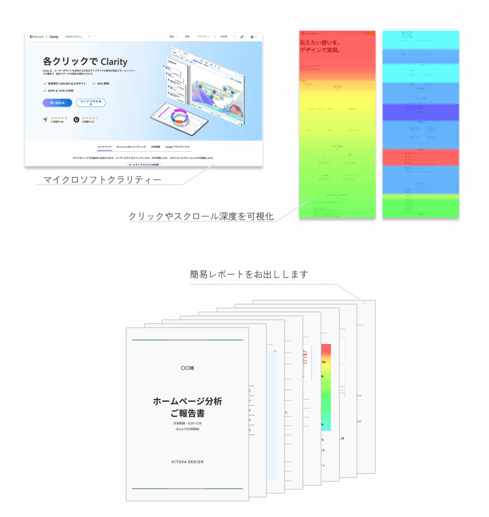 初回レポート:納品から約1ヶ月 or 1000PV(ページ閲覧数)到達を目安に、ユーザー行動の解析結果をレポートでご案内します。