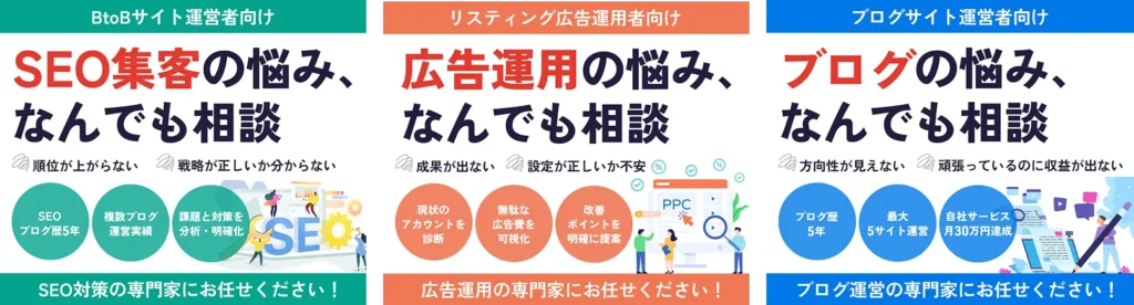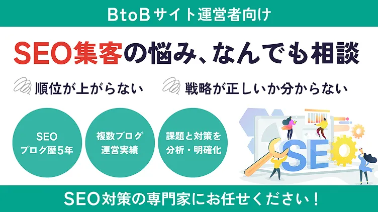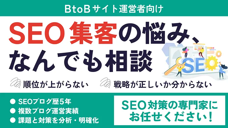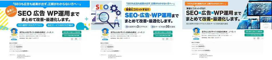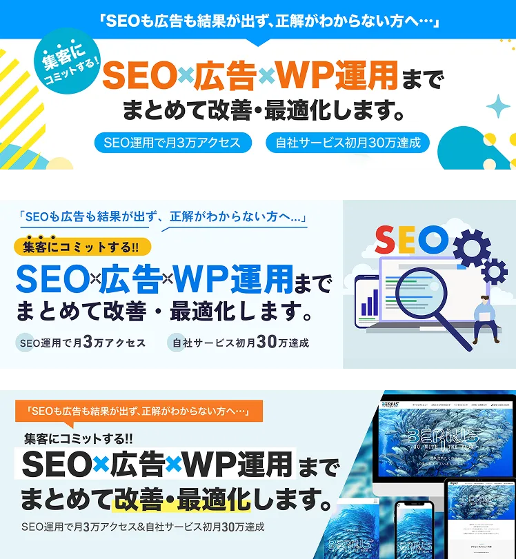 (B案)・SEOのイメージでGoogleカラーを使用したイラストを配置。左から目線が動くので左に文字を配置。イラストはビジネス向けのシンプルなものを採用し信頼感を持たせました。